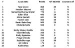 Abigail Amos gets her third counter at Loughborough in at 1727 Paulina Jurkowska in at 1427 with 10 points, Jessica Matthews in at 1427 with 10 points, Nadia Rawson up 27 to 1340. 1 from Loughborough Danielle Daley up 339 to 1300. 9 from Loughborough Tabitha Holmes in at 1181. 18 from Loughborough Hannah Smith in at 1151. 18 from Loughborough Lauryn John-Baptiste up 262 to 1131. 9 from Loughborough Soumeya Anane up 115 to 941. 9 from Loughborough replace 1 Eliz Maloney up 108 to 892. 9 from Loughborough replace 1 Ali Collins up 42 to 440. 30 from Loughborough replace 4(halved) Jodie Burrage 22 to 411. 18 off from Thailand replaced by 1 Emily Appleton up 22 to 343. 30 from Loughborough replace 10
