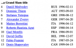 ...an ATP title ...an ATP final ...an ATP semifinal 22 Felix Auger Aliassime CAN 2000-08-08 37 Jan Lennard Struff GER 1990-04-25 73 Hugo Dellien BOL 1993-06-16 32 Daniel Evans GBR 1990-05-23 73 Hugo Dellien BOL 1993-06-16 74 Stefano Travaglia ITA 1991-12-18 37 Jan Lennard Struff GER 1990-04-25 74 Stefano Travaglia ITA 1991-12-18 78 Mikael Ymer SWE 1998-09-09 41 Filip Krajinovic SRB 1992-02-27 78 Mikael Ymer SWE 1998-09-09 84 Gregoire Barrere FRA 1994-02-16 47 John Millman AUS 1989-06-14 80 Tommy Paul USA 1997-05-17 87 Soon Woo Kwon KOR 1997-12-02 48 Casper Ruud NOR 1998-12-22 82 Jannik Sinner ITA 2001-08-16 89 Dominik Koepfer GER 1994-04-29 54 Miomir Kecmanovic SRB 1999-08-31 84 Gregoire Barrere FRA 1994-02-16 93 Yasutaka Uchiyama JPN 1992-08-05 55 Aljaz Bedene SLO 1989-07-18 86 Thiago Monteiro BRA 1994-05-31 94 James Duckworth AUS 1992-01-21 56 Alexander Bublik KAZ 1997-06-17 87 Soon Woo Kwon KOR 1997-12-02 96 Alexei Popyrin AUS 1999-08-05 62 Cameron Norrie