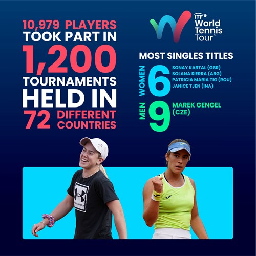 "In womens singles events, four players won six titles each Great Britains Sonay Kartal, Argentinas Solana Sierra, Romanias Patricia Maria Tig and Indonesias Janice Tjen."