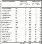 The 2021 top 10 total is 2055. So indeed a fair bit down on the current rankings top 10 total, mainly due to the 2021 relative performances of Heather, Jodie and Sam ( replaced by Tara ). Beth is the one with the most positive 2021 figure (276) against her current ranking of WR 319. Noticeable indeed is that ranking for Jodie, confirming the feeling that her 2021 wasn't that great in spite of her above discussed climbing WR.