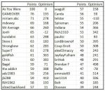 Here's the starting table, with a measure of how optimistic people are compared to the current top ten total of 1778. Being optimistic or pessimistic doesn't seem to affect the points !