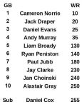 As in the 2022 competition one substitute player is allowed, who must be named as such at the same time as the main selection of 10. Their predicted WR must also be given. The eleventh player may be substituted for any one of your main selections, but only in the two weeks immediately following the end of Wimbledon (i.e. 17th to 29th July only, to be confirmed precisely nearer the time). This will give a little flexibility, particularly in the case of long-term injuries, and will make it more interesting. The substitute will take your prediction of the GB ranking of the player they replace, so for example if you replaced Ryan Peniston (GB #6) with Billy Harris, Billy would become your #6 prediction so think carefully ! Continuing from last year, there will be two dummy entries, AsYouWere (based on the starting rankings) and Mr Average (based on everyones WR predictions).