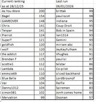 Here are the starting points for this year's competition. An interesting set of predictions with a wide range. Ralphi is the most optimistic with a prediction of a rise of 451 places for our top 10, with telstar being the most pessimistic with a fall of 280 places. If anyone disagrees with their points please send me a private message with your query and I will look into it, rather than discuss it in this thread.